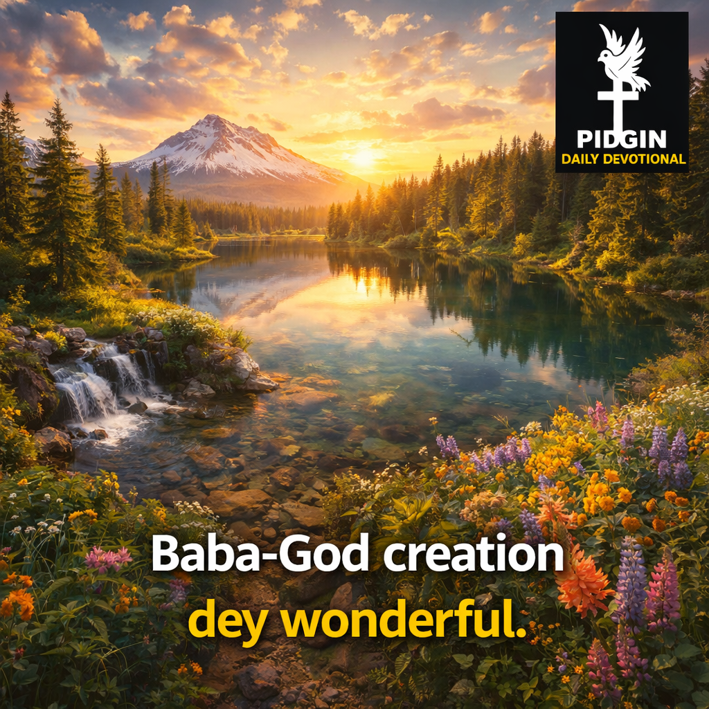 Message: Today, make you pause small to admire wetin Baba-God sabi do. Pidgin proverb tok sey, “Who no stop look sky, fit miss rainbow.” If you no slow down appreciate Baba-God creations, you fit miss di beauty wey He put around you everi day. Look di sun as e dey rise, di moon as e dey shine for night, di ocean wey deep no get end, and di birds wey dey sing like choir. Baba-God paint di world like masterpiece wey no artist fit copy. From di smallest ant to di biggest elephant, everitin get God signature.